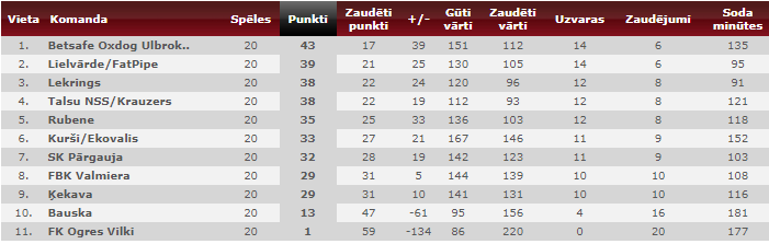 In the Men’s Elvi liga, Betsafe Oxdog Ulbroka won the regular season with 43 points. Lielvärde/FatPipe was second with 39 points and Lekrings and Talsu NSS/Krauzers got the third and the fourth place in the table. FK Ogres Vilki was unfortunate this season, getting only one point. Final standings can be found from the table below.