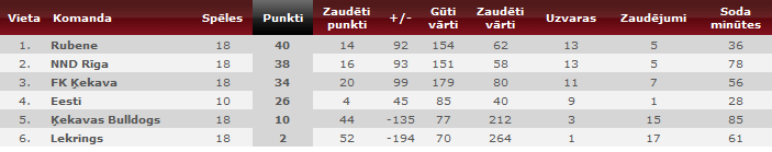 In the Women’s Elvi liga, Rubene won the regular season with 40 points. NND Riga was second with 38 and FK Ķekava was placed third with 34 points. Eesti, being the Estonian Women’s National team, took the fourth place, but Ķekavas Bulldogs take the last place in the semi-finals, being the fourth best league team.