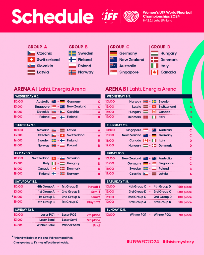 The final round of the 11th Women’s U19 World Floorball Championships will be played from 8th – 12th May 2024 at the Lahti Energia Areena in the Lahti Sports and Fair Centre in Lahti, Finland.